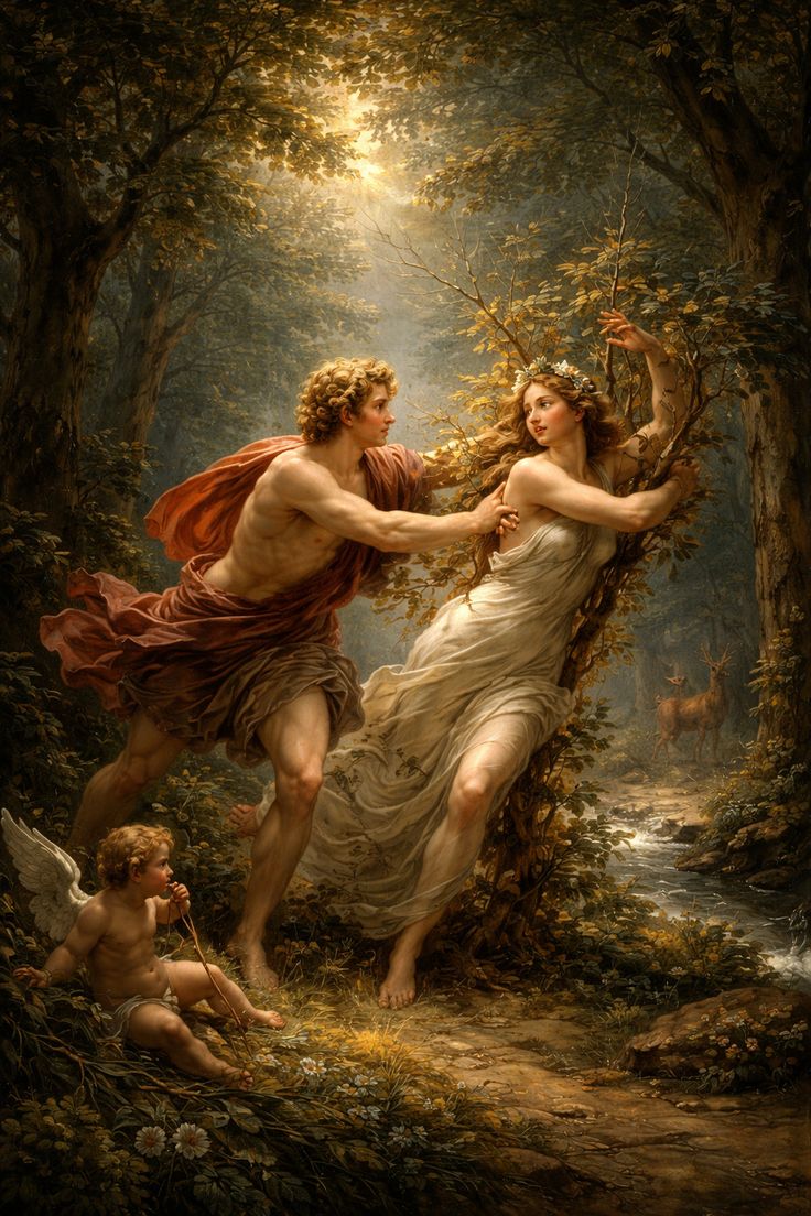 다프네 신화는 겉보기에는 단순한 사랑 이야기처럼 보이지만, 그 구조를 자세히 살펴보면 매우 복합적인 의미를 담고 있습니다. 태양의 신 아폴론은 에로스의 장난으로 인해 갑작스럽게 사랑에 빠지게 되지만, 다프네는 그러한 감정을 전혀 받아들이지 않습니다. 오히려 그녀는 아폴론을 피해 끊임없이 도망치며 자신의 삶과 자유를 지키려고 합니다. 이 장면은 ‘사랑’이라는 감정이 반드시 상호적이지 않으며, 때로는 폭력적인 형태로 나타날 수 있음을 보여줍니다. 특히 이 신화에서 중요한 점은 아폴론이 신이라는 절대적인 권력을 가진 존재라는 것입니다. 반면 다프네는 상대적으로 약한 위치에 있는 존재로, 이 둘의 관계는 단순한 연애 관계가 아니라 권력의 불균형이 존재하는 구조로 해석할 수 있습니다. 이러한 맥락에서 다프네의 도망은 단순한 회피가 아니라 ‘자기 보호’이자 ‘저항’의 의미를 갖게 됩니다. 결국 다프네는 자신의 아버지에게 도움을 요청하여 월계수 나무로 변하게 됩니다. 이 장면은 매우 상징적인데, 인간으로서의 삶을 포기하면서까지 자신의 자유를 지키겠다는 극단적인 선택을 보여줍니다. 이는 자유의 가치가 얼마나 중요한지를 강조하는 동시에, 인간이 극한 상황에서 어떤 선택을 할 수 있는지를 보여주는 사례입니다. 또한 이 변신은 물리적인 도피를 넘어 ‘존재의 전환’이라는 철학적 의미를 내포하고 있어 인문학적으로 매우 깊은 해석이 가능합니다.